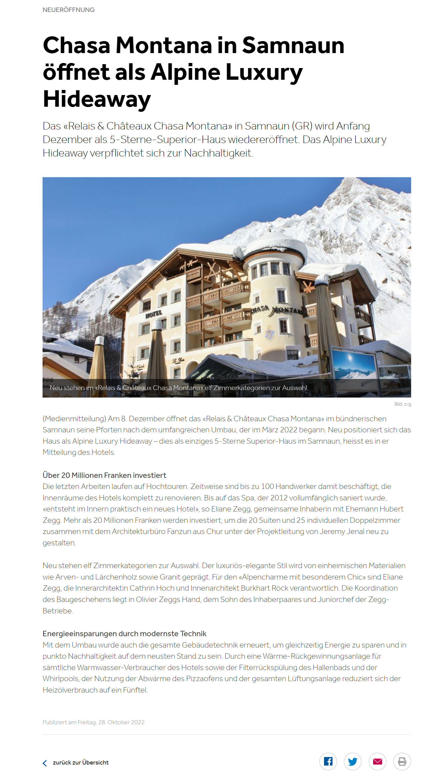 03/11/2022 Medienmitteilung Chasa Montana Chasa Montana in Samnaun öffnet als Alpine Luxury Hideaway htr.ch Download