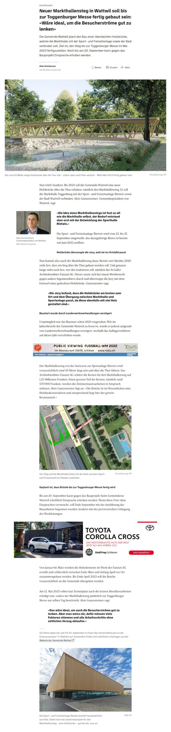 18/11/2022 Alain Rutishauser Neuer Markthallensteg in Wattwil soll bis zur Toggenburger Messe fertig gebaut sein: „Wäre ideal, um die Besucherströme gut zu lenken“ Limmattaler Zeitung Download